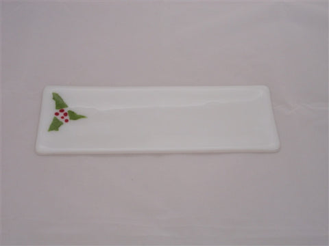 Christmas holly on a snow white plate. Shallow rectangular plate with gentle curve, size: 105 x 315 x 15 mm. Suggested uses: display, serving slices or biscuits.