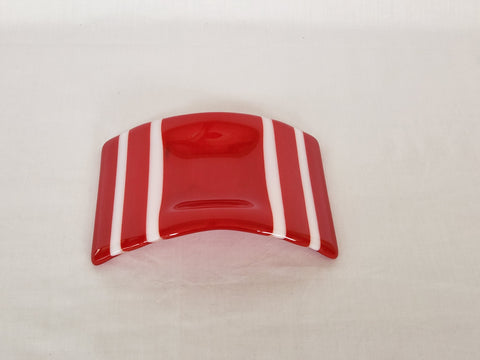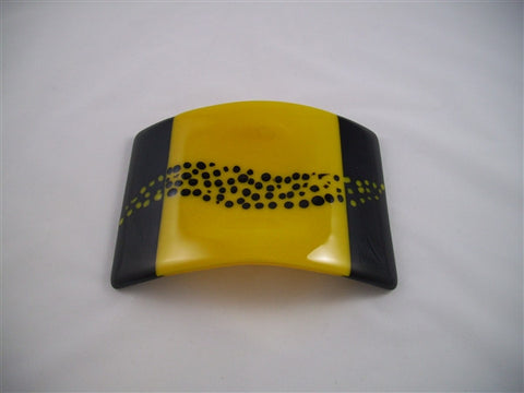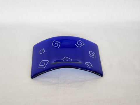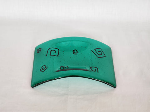 Opalescent spring dish with black bands and a colour changing breeze. A candle bridge, size: 125 x 185 x 45 mm. Suggested uses: pillar or tea light candles.