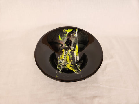 Swirls of melted glass featuring on an opalescent black plate. A deep classic style bowl with rim flared outwards, size: 285 dia. x 70 mm. Suggested uses: display, fruit bowl.
