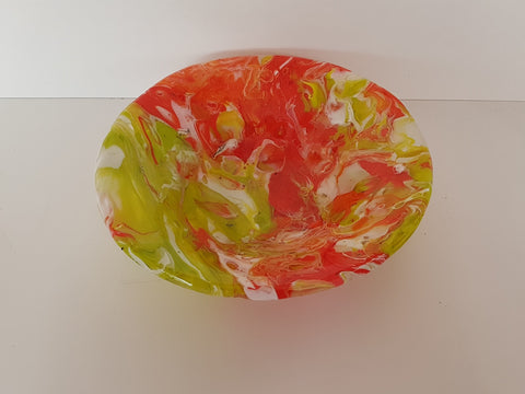 Swirls of melted glass. A unique one of a kind plate. A deep classic style bowl with rim flared outwards, size: 285 dia. x 70 mm. Suggested uses: display, fruit...