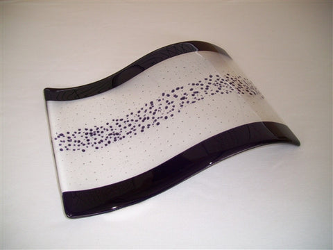 Deep purple sprinkles suspended in clear between transparent deep purple bands. A double curved decorative piece, size: 245 x 355 x 50 mm. Suggested uses: display on a coffee table...