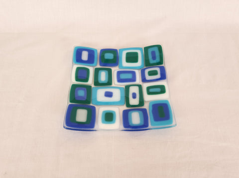 Swirls of melted glass. A unique one of a kind plate. Square plate with corners flared upwards, size: 200 x 200 x 30 mm. Suggested uses: display, trinket dish, sweets...
