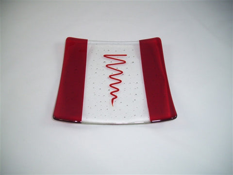 Red squiggle suspended in clear between transparent red bands. Square plate with corners flared upwards, size: 200 x 200 x 30 mm. Suggested uses: display, trinket dish, sweets dish.