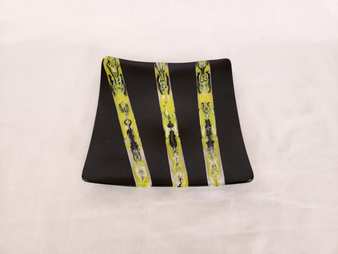 Swirls of melted glass featuring on an opalescent tangerine and black plate. Square plate with corners flared upwards, size: 200 x 200 x 30 mm. Suggested uses: display, trinket dish,...