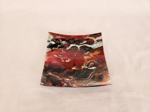 Swirls of melted glass. A unique one of a kind plate. Square plate with corners flared upwards, size: 150 x 150 x 25 mm. Suggested uses: display, trinket dish, sweets...