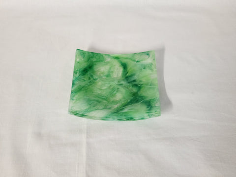 Swirls of melted glass. A unique one of a kind plate.Square plate with corners flared upwards, size: 150 x 150 x 25 mm.Suggested uses: display, trinket dish, sweets dish.