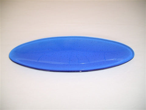 Transparent true blue plate, simply a delight. A long oval dish with flat base and shallow sides, size: 170 x 460 x 30 mm. Suggested uses: display, table centrepiece, fruit...
