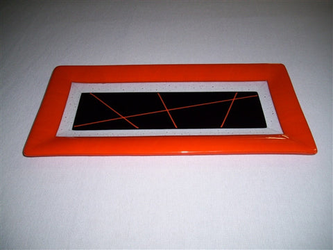 Opalescent orange plate with black bands and orange pinwheels. Rectangular plate with a flat base and sloping border, size: 190 x 390 x 25 mm. Suggested uses: display, sandwich plate,...