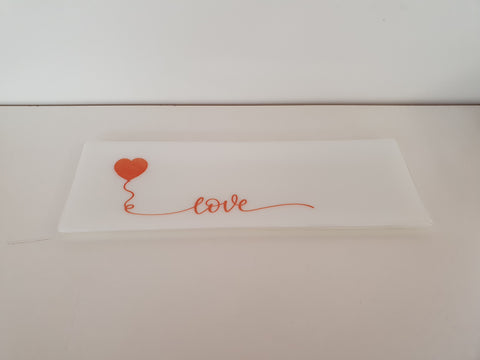 Red love balloon on a white opalescent plate. Shallow rectangular plate with gentle curve, size: 130 x 380 x 15 mm. Suggested uses: display, serving slices, savouries, add a mini...