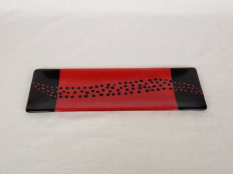 Opalescent red plate with black bands and red pinwheels (satin finish). Shallow rectangular plate with gentle curve, size: 130 x 380 x 15 mm. Suggested uses: display, serving slices or...