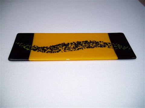Opalescent sunflower plate with black bands and a colour changing breeze. Shallow rectangular plate with gentle curve, size: 130 x 380 x 15 mm. Suggested uses: display, serving slices, savouries,...