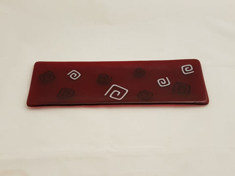 Transparent red plate with black and white pinwheels. Shallow rectangular plate with gentle curve, size: 105 x 315 x 15 mm. Suggested uses: display, serving slices or biscuits.